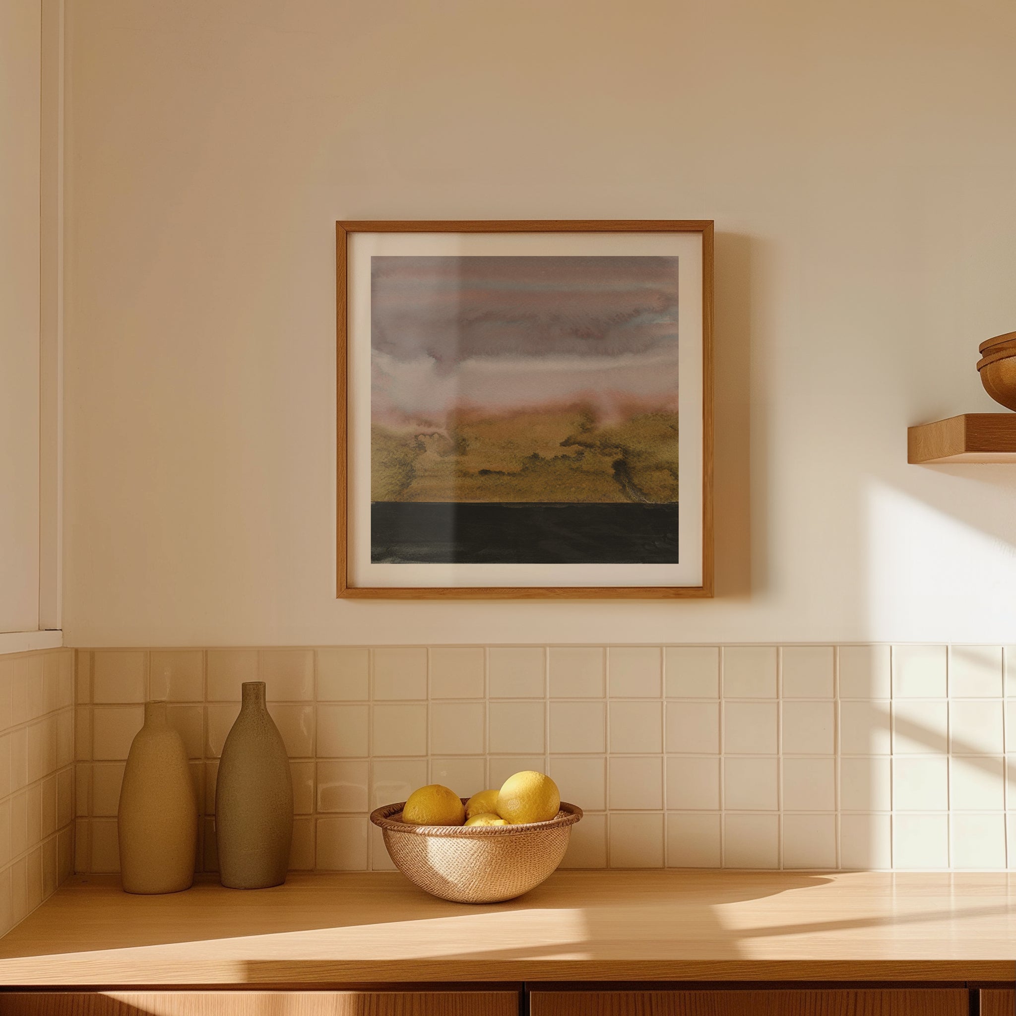 Brooding skies in muted rose and slate gather above a darkened horizon, while textured washes of ochre and shadow create a sense of shifting atmosphere. Originally painted in inks, the artwork captures movement, depth and the quiet drama of landscape at dusk.