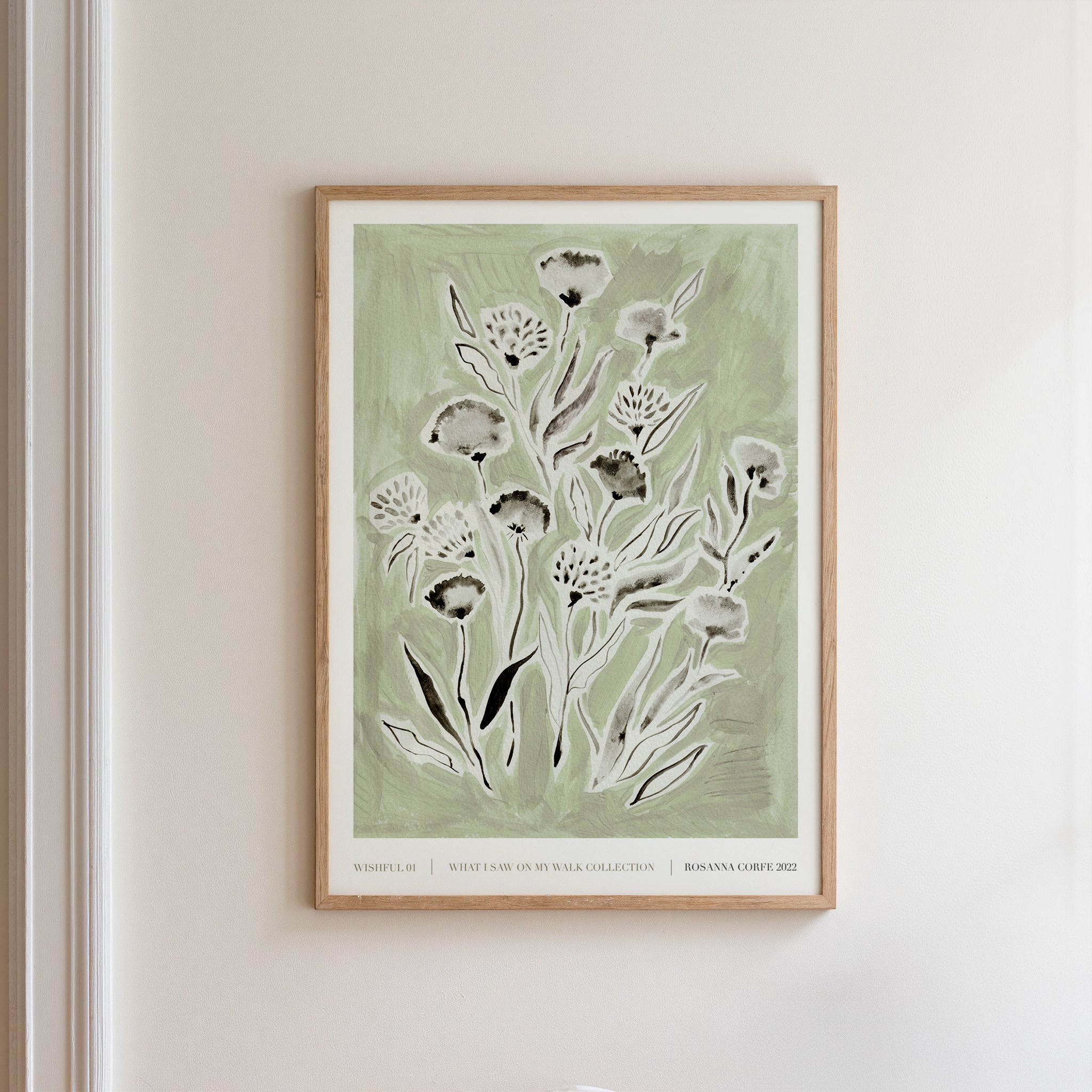 Wishful Green is a softly layered floral print by Rosanna Corfe, featuring gentle green tones and loose, expressive brushwork. The abstracted flower forms and subtle textures give the piece a calm, natural feel that’s easy to live with.