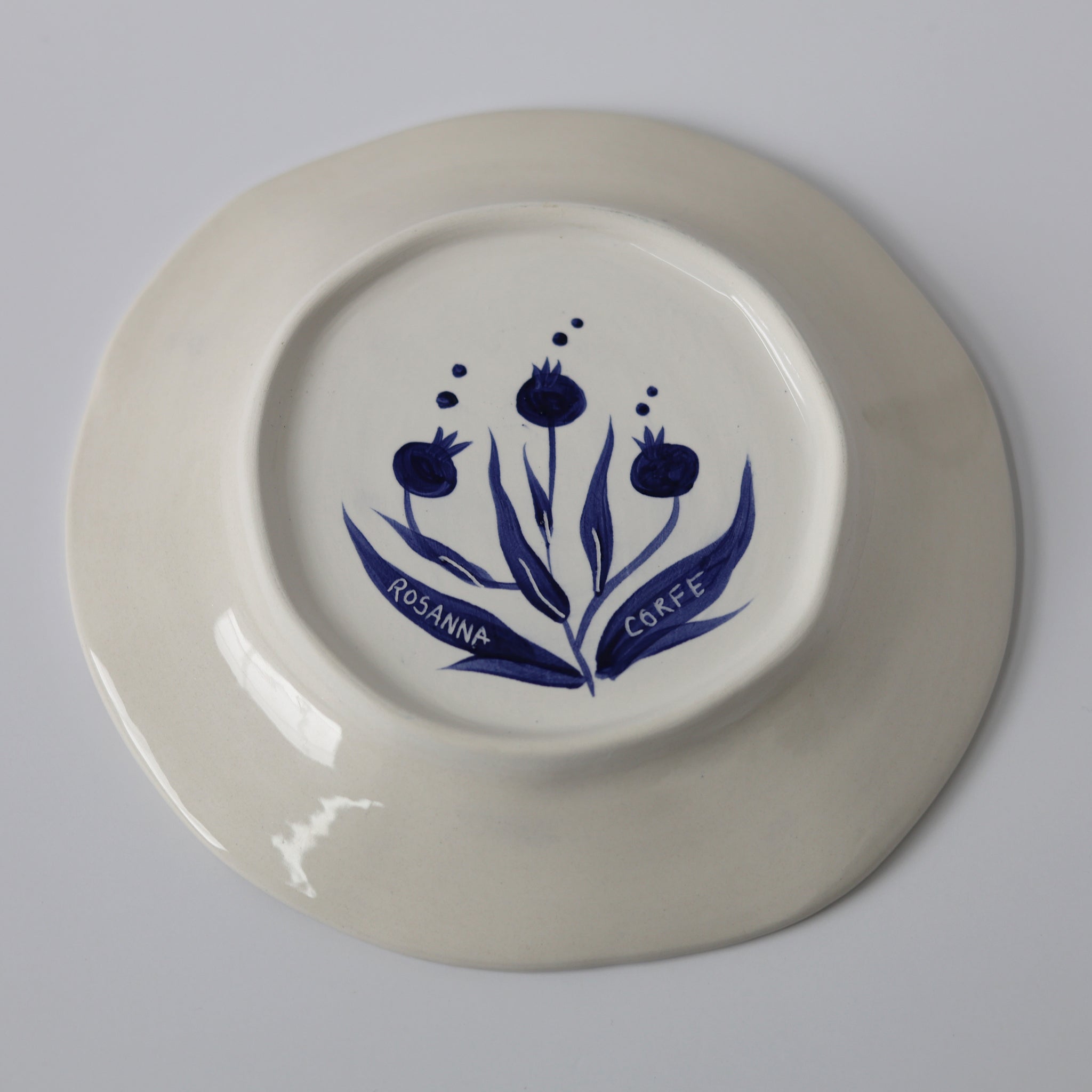 This hand-painted ceramic plate features Rosanna Corfe’s signature pomegranate motif in a rich, deep blue, painted with fluid brushstrokes and scattered botanical details across a warm, natural earthenware base.
