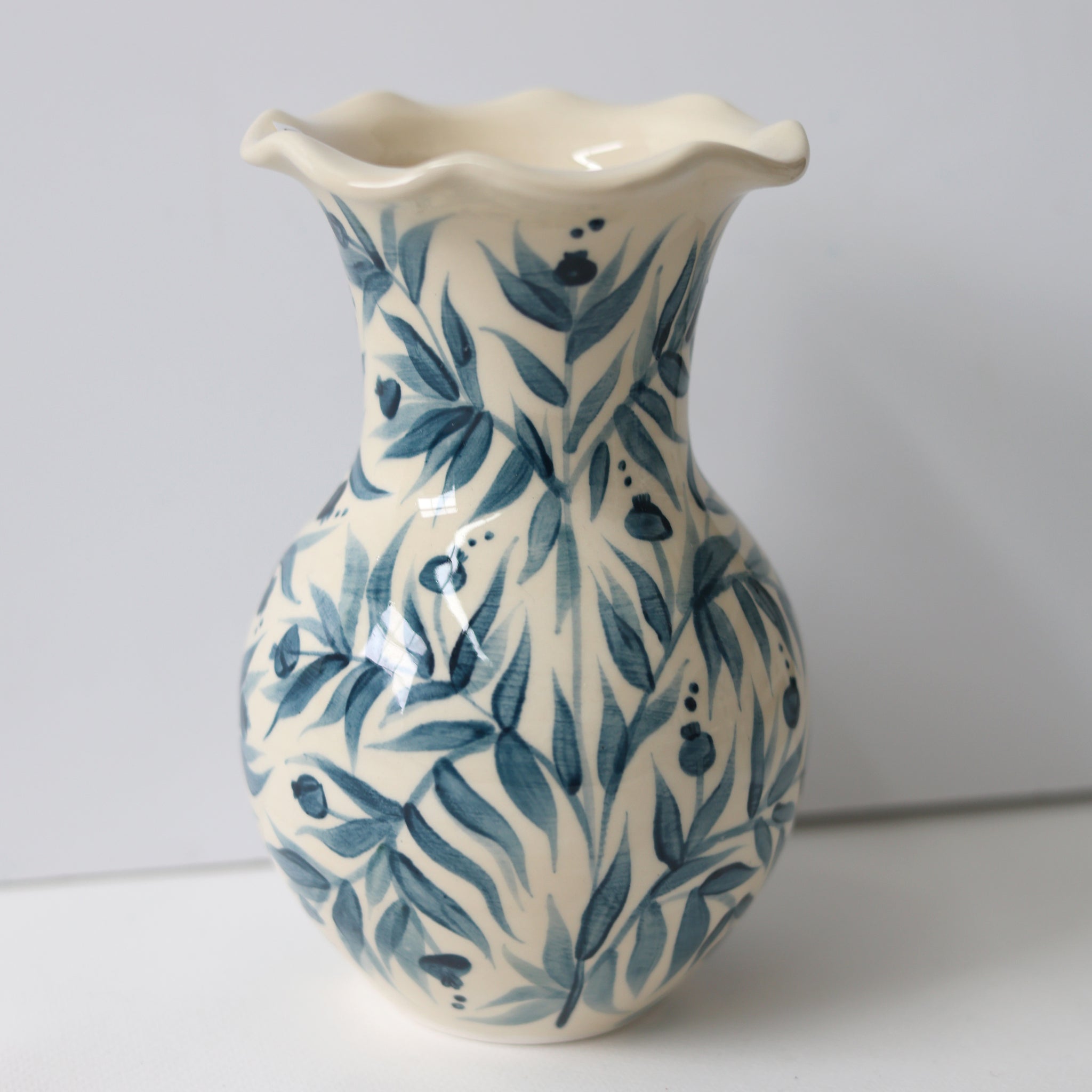 This scalloped ceramic vase is handcrafted in Italy by skilled artisans, then hand-painted by Rosanna Corfe in her London studio. It features her signature Pomegranate motif, painted in rich teal tones against a soft, warm base, with fluid brushstrokes that wrap naturally around the form.