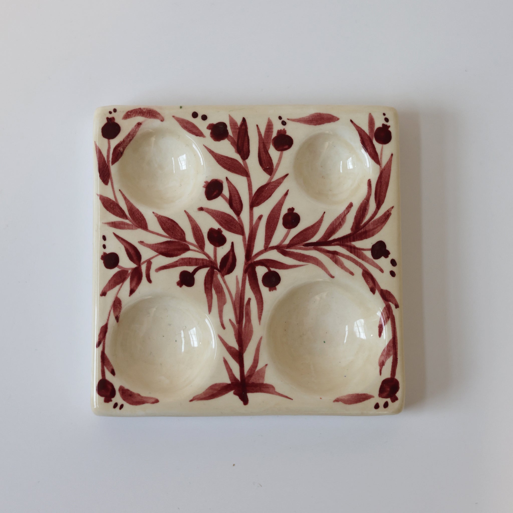 A ceramic paint palette featuring a deep maroon pomegranate design, hand-painted in London. Each 10x10cm palette has four paint wells and a smooth glazed surface, perfect for mixing watercolour, gouache, or ink. A thoughtful gift for yourself or for someone who loves to paint.