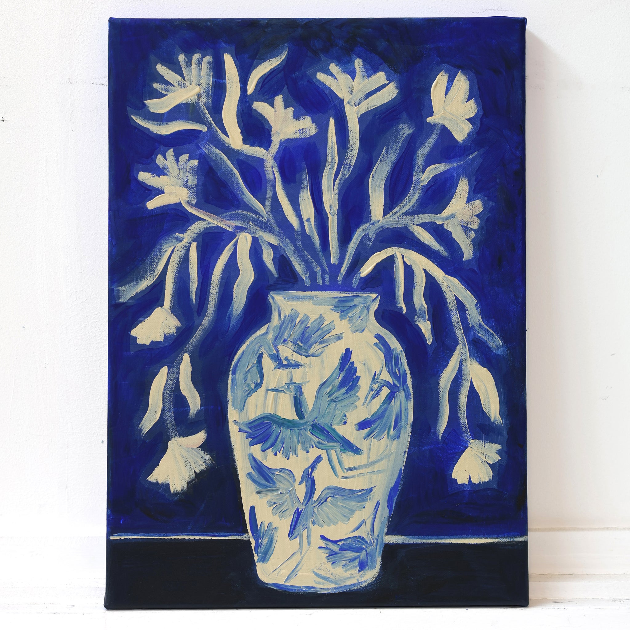 This piece reimagines Rosanna’s hand-painted ceramic vase motif in layered blues and creamy neutrals. Blue Herons Vase captures the grace of the heron - a recurring symbol of patience and reflection in her work. The interplay between pattern, form, and negative space gives the composition both rhythm and calm.